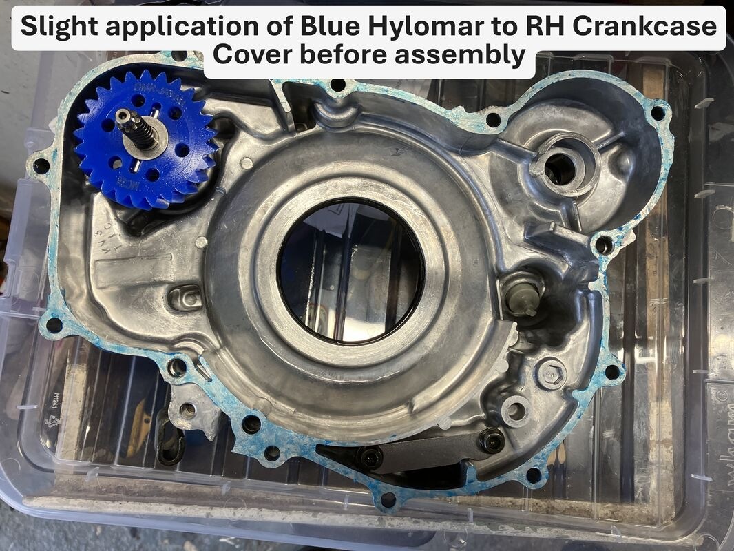 Slight application of Blue Hylomar to RH Crankcase Cover (love the stuff, been using it since the 60s!!! well it was ok for Rolls Royce so who am I to argue, ok it may have been used on Jet Engines LOL).