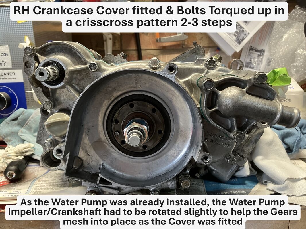 A slight manipulation of the Water Pump Impeller/Crankshaft was required to help mesh the Gears whilst trying to get the Crankcase Cover home before bolting everything up.