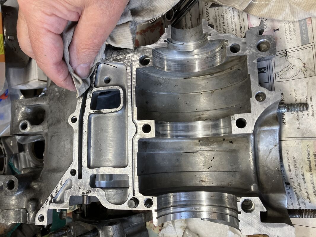 Final clean of Crankcase mating surfaces ready for the application of HONDA Threebond.