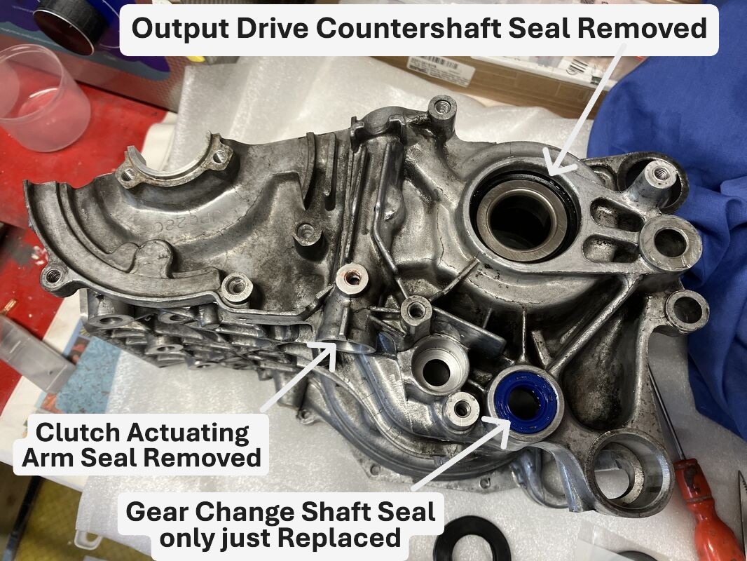 Output Drive Countershaft/Clutch Actuating Arm Oil Seals Removed (left the Gear Change Shaft Oil Seal as it has only just been changed in situ due to a slight Oil Leak).