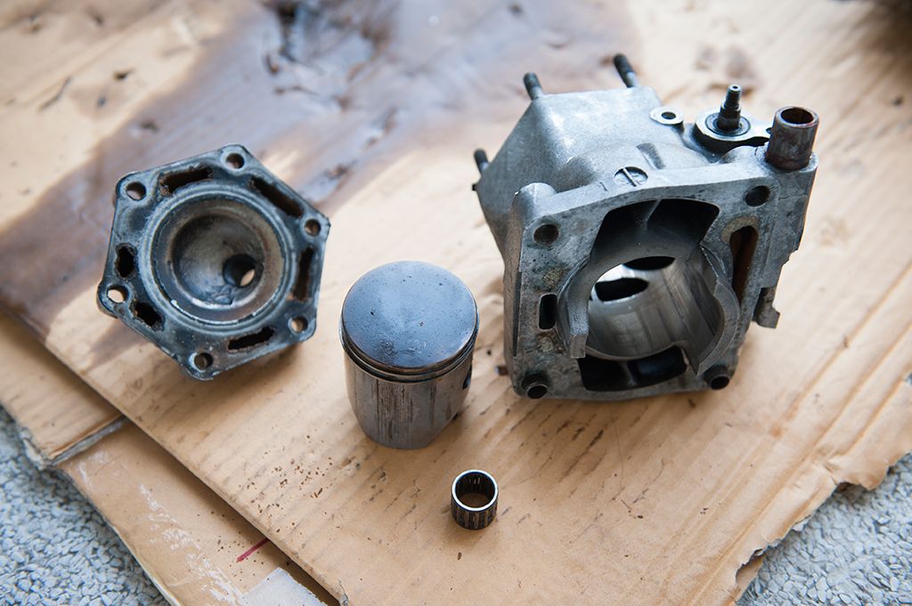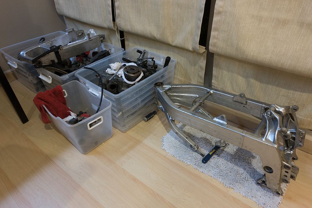 Of course the carbs were going to have to come off for a clean, and then I noticed that the power valve cables were a rusty mess, and one of the valves was sticking too. In the end though it was a small but prominent patch of flaking silver paint on the frame which made me think screw it, let’s get the whole damn thing apart.